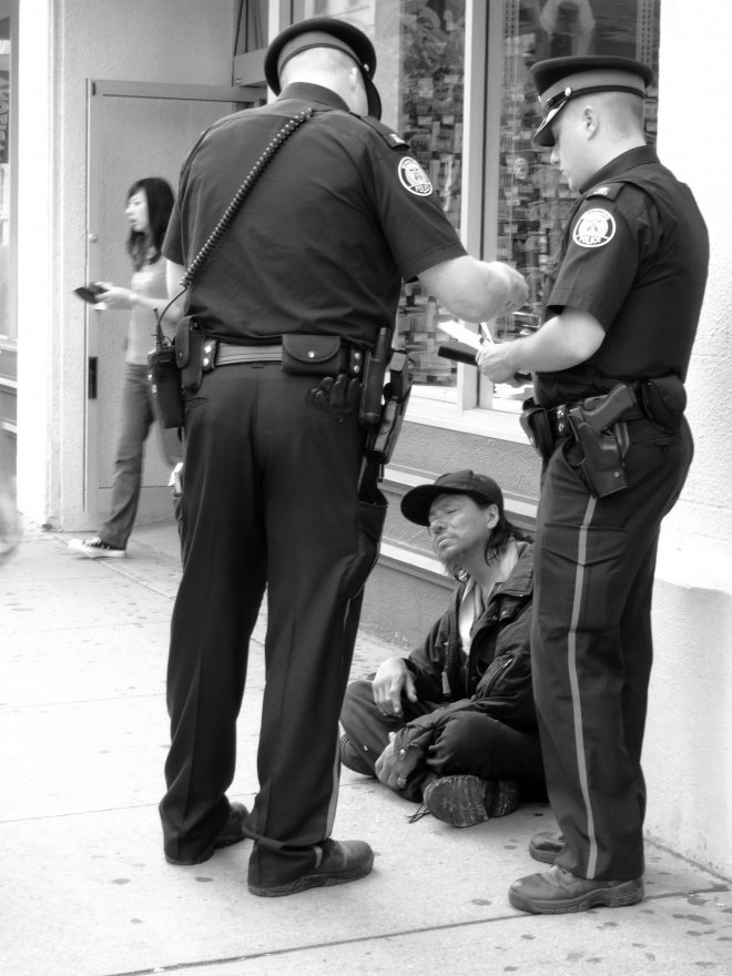 Es gibt aber neben dieser Mehrheitsperspektive, die sowohl die mediale als auch die philosophische Debatte dominiert, auch noch die Perspektive anderer Gruppen von Menschen. Die Perspektive von Menschen nämlich, die regelmäßig und oft mit der Polizei in Kontakt kommen: Wohnungslose, Drogennutzer_innen, Prostituierte, Refugees, Arme.[2] Sie erfahren polizeiliche Interventionen in ihrem Alltag meistens als repressive Eingriffe: Sie werden Opfer wiederholter Kontrollen, Durchsuchungen, Razzien oder Verhaftungen, leiden unter Schikanen, Beleidigungen und physischer Gewalt. Diese Menschen sind aus der Gemeinschaft jener, deren Sicherheit die Polizei schützen soll, schlicht ausgeschlossen. Sie sind immer nur Objekte, nie Subjekte polizeilichen Handelns, und sie würden daher auch niemals selbst die Polizei rufen. Die Perspektive dieser „polizeilichen Klientel“ kommt in den Medien nicht vor, sie werden nur Gegenstand von Debatten, die andere über sie führen. Und schließlich bleiben die Erfahrungen und Perspektiven dieser Menschen, in deren Alltag die Polizei lediglich ein Faktor der Unterdrückung ist, auch in der politischen und philosophischen Theoriebildung unterbelichtet.