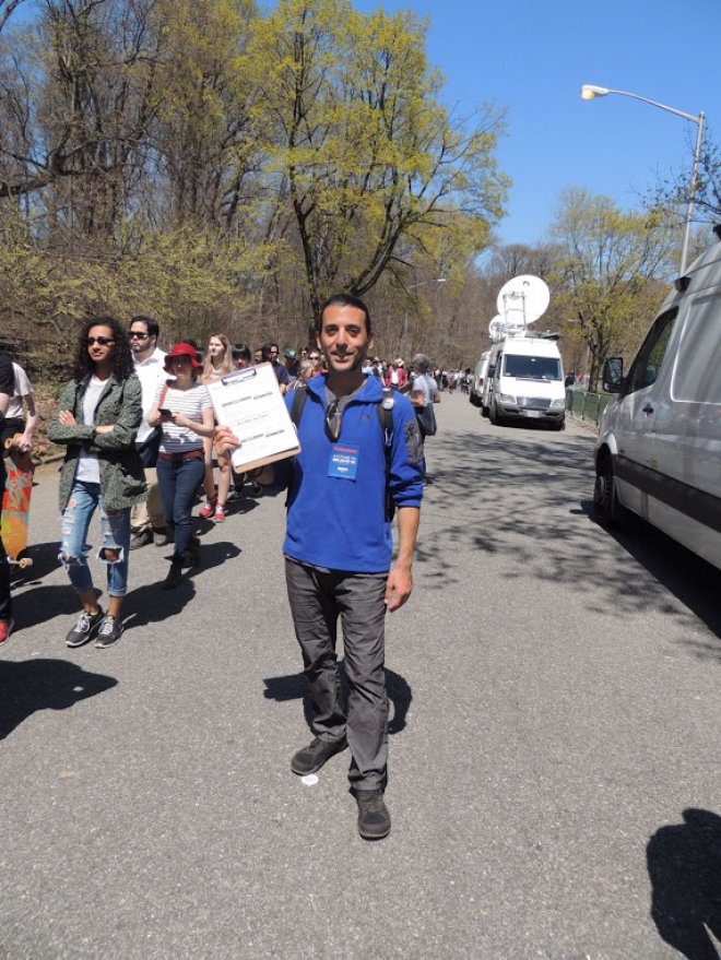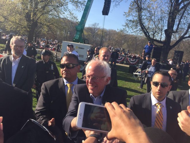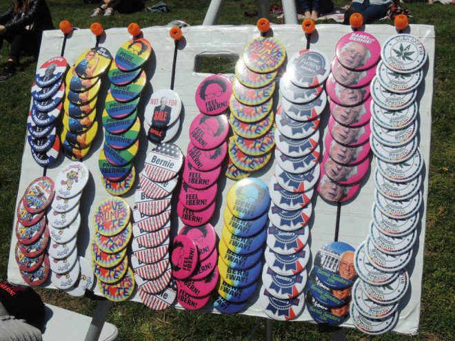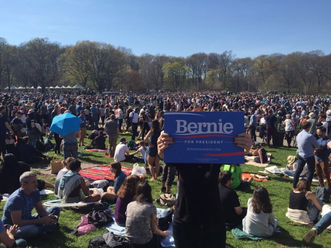 Julia und Mark, beide um die fünfzig, weiße Mittelschicht und aus New York City, haben kein Problem damit, sich Sozialist*innen zu nennen. Sie sind, anders als viele Amerikaner*innen, auch schon immer wählen gegangen. Immer demokratisch. Heute setzen sie große Hoffnung auf Bernie Sanders: „Es muss sich etwas ändern, sonst bringt es die Mittelschicht um." Wie Julia und Mark haben sich rund 28.000 Menschen an diesem sonnigen Sonntagnachmittag weder von den Schlangen vor den Metalldetektoren noch von anderen Tätigkeiten, die man bei wunderbarem Frühlingswetter machen kann, aufhalten lassen. Und die Sicherheitsbehörden nehmen ihre Aufgabe sehr ernst. Sie werden auch nicht von irgendwem durchgeführt. Der National Security Service (NSA) höchstselbst bittet darum, die Taschen zu öffnen und durch die Schleuse zu schreiten. Immerhin geht also auch die NSA davon aus, dass der Hauptredner heute Präsident der Vereinigten Staaten werden könnte. In der Warteschlange, die sich vor den Sicherheitsschleusen hunderte von Metern durch den Park windet, werden derweil noch für die letzten Stunden dieses Wahlkampfes freiwillige Helfer*innen akquiriert.
