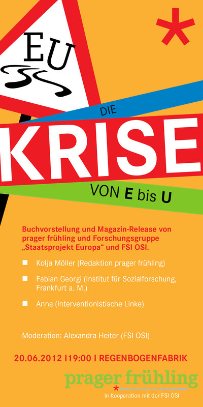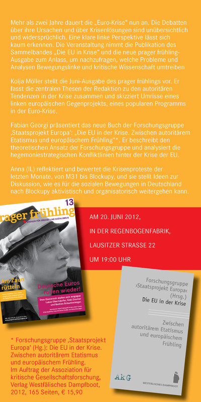 Mehr als zwei Jahre dauert die „Euro-Krise“ nun an. Die Debatten über ihre Ursachen und über Krisenlösungen sind unübersichtlich und widersprüchlich. Eine klare linke Perspektive lässt sich kaum erkennen. Die Veranstaltung nimmt die Publikation des Sammelbandes „Die EU in Krise“ und die neue prager frühling- Ausgabe zum Anlass, um nachzufragen, welche Probleme und Analysen Bewegungslinke und kritische Wissenschaft umtreiben. Kolja Möller stellt die Juni-Ausgabe des prager frühlings vor. Er fasst die zentralen Thesen der Redaktion zu den autoritären Tendenzen in der Krise zusammen und skizziert Umrisse eines linken europäischen Gegenprojekts, eines popularen Programms in der Euro-Krise. Fabian Georgi präsentiert das neue Buch der Forschungsgruppe ‚Staatsprojekt Europa‘: „Die EU in der Krise. Zwischen autoritärem Etatismus und europäischem Frühling“. Er beschreibt den theoretischen Ansatz der Forschungsgruppe und analysiert die hegemoniestrategischen Konfliktlinien hinter der Krise der EU. Anna (IL) reflektiert und bewertet die Krisenproteste der letzten Monate, von M31 bis Blockupy, und sie stellt Ideen zur Diskussion, wie es für die sozialen Bewegungen in Deutschland nach Blockupy aktivistisch und organisatorisch weitergehen kann.