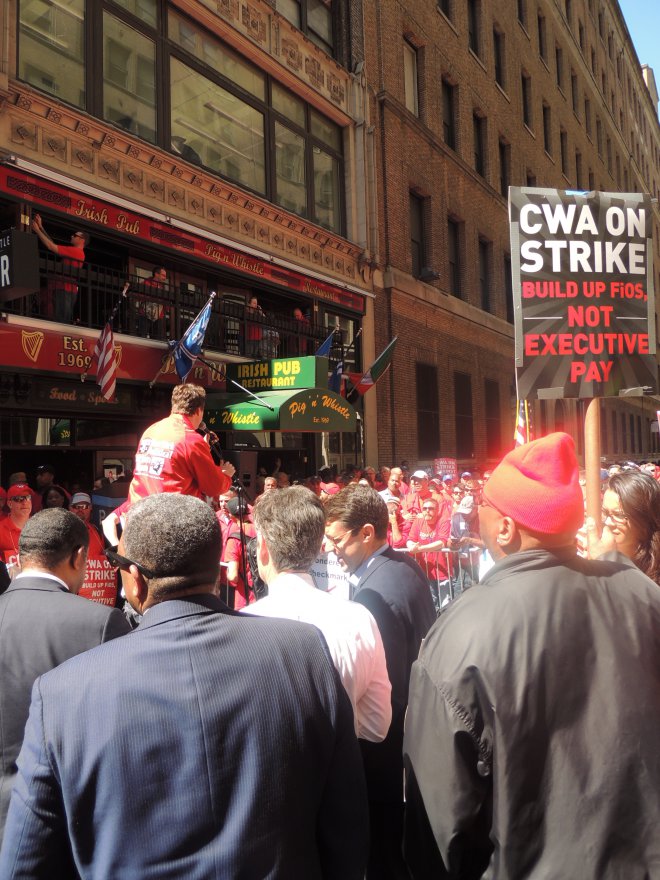 Obwohl Verizon eines der profitabelsten Unternehmen der USA ist, hat die Geschäftsführung massive Einschnitte in der Krankenversicherung und bei Pensionsansprüchen angedroht. Hiergegen richtet sich der Ausstand. Bernie Sanders erklärte sich mit den Streikenden solidarisch und besuchte in den vergangenen Tagen Streikversammlungen. Genau so wie die WTP, die auf der heutigen Demonstration in Midtown von Bill vertreten wird.